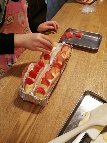オムレットレッスン 未分類 2022.04.02 苺を持つ可愛い手♡今日も.みんな頑張りました!新年中新小3新小3小学生組は去年の夏にパン教室にも来てくれました。パンを作ることよりも道具を使うし、神経を使う工程が多いけど集中して頑張りましたよ。年中さんも、正しい持ち方で絞り出してました。すばらしい!∵∵∵オムレットがとても好評で嬉しい感想を頂いてます😊楽しく作るだけを目標とせず美味しさにも拘りました。