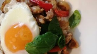 休日のお昼ご飯甘酒の甘みを使たガパオライスです。おいしくできました!バジルで爽やかさプラスして。美味しくできました~