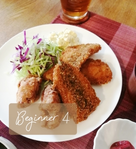 Beginner4 未分類 2021.09.01 今日はBeginnerレッスン。『揚げる』と『鯵の3枚おろし&鰯の手開き』を重点的に。□鯵フライ□鰯のフライ□鶏の唐揚げ□タルタルソース□アラの潮汁□タコと胡瓜の胡麻酢魚を触るのが苦手な生徒さんですが、ビニール手袋二重にして頑張りました。包丁の扱いもドンドン上達してて、トントン♪と音を立てながら切れるように。唐揚げは、二度揚げしなくてもカラッとジューシーに揚がるポイントがあります。Dailyレッスンても来月唐揚げレッスンしようと思ってます。